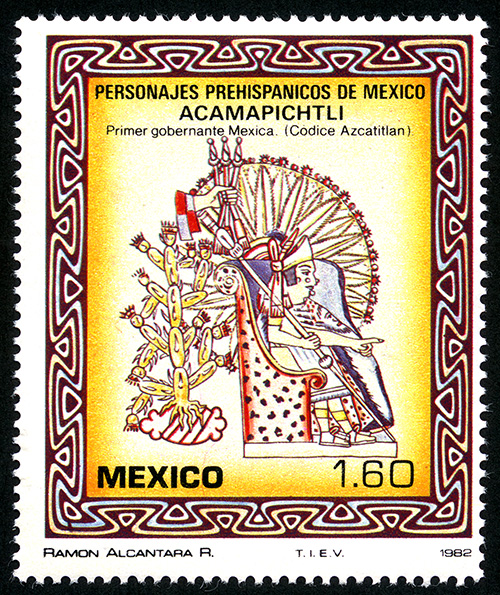 No. Scott: 1286 -- Año de Emisión: 1982 -- Valor facial: Un Peso con Sesenta Centavos -- Variedad de color: Multicolor -- Perforación: 14 -- Tipo de impresión: GrabadoTimbre Postal Mexicano multicolor, en la imagen observamos a un personaje de la época prehispánica, posiblemente sea un gobernante quien se encuentra sentado en una silla, en una mano lleva una lanza, en la parte de atrás, se observa un escudo de plumas y una planta que parece ser un nopal, en la parte superior está escrito "PERSONAJES PREHISPANICOS DE MEXICO, ACAMAPICHTLI", "Primer Gobernante Mexica", en la parte inferior "MEXICO" y el valor facial de "1.60".