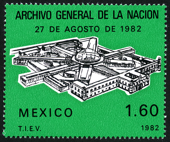 No. Scott: 1298 -- Año de Emisión: 1982 -- Valor facial: Un Peso con Sesenta Centavos -- Variedad de color: Verde y Negro -- Perforación: 14 1/2 x 14 -- Tipo de impresión: Grabado Timbre Postal Mexicano en colores verde y negro, en la imagen observamos una vista panorámica de un edificio poligonal, con una cúpula central, en la parte superior está escrito "ARCHIVO GENERAL DE LA NACION, 27 DE AGOSTO DE 1982", en la parte inferior "MEXICO" y el valor facial de "1.60". Para más información favor de dirigirse a biblioteca@mufi.org.mx