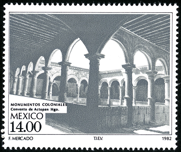 No. Scott: 1306 -- Año de Emisión: 1982 -- Valor facial: Catorce Pesos -- Variedad de color: Gris y Negro -- Perforación: 14 1/2 x 14 -- Tipo de impresión: Grabado Timbre Postal Mexicano en colores gris y negro, en la imagen observamos la fachada de un monumento colonial, correspondiente al Convento de Actopan en el Estado de Hidalgo, también aparece escrita la palabra "MEXICO" y el valor facial de "14.00". Para más información favor de dirigirse a biblioteca@mufi.org.mx