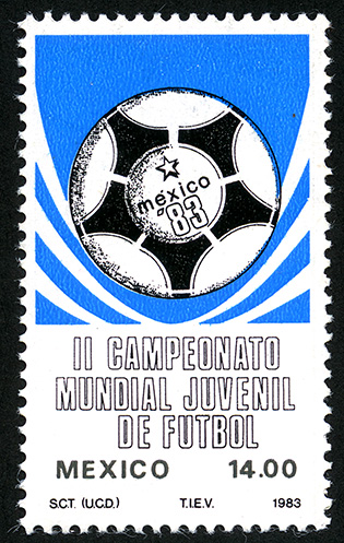 No. Scott: 1317 -- Año de Emisión: 1983 -- Valor facial: Catorce Pesos -- Variedad de color: Rojo y Negro -- Perforación: 14 -- Tipo de impresión: Grabado Timbre Postal Mexicano en colores azul y negro, al fondo de la imagen se observan unas línes curvas y sobre las mismas, un balón de futbol soccer, dentro de un círculo aparece una estrella y "México 83", en la parte inferior está escrito "II CAMPEONATO MUNDIAL JUVENIL DE FUTBOL", "MEXICO" y el valor facial de "14.00". Para más información favor de dirigirse a biblioteca@mufi.org.mx