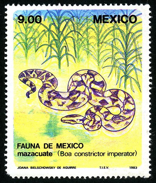 No. Scott: 1326 -- Año de Emisión: 1983 -- Valor facial: Nueve Pesos -- Variedad de color: Multicolor -- Perforación: 14 -- Tipo de impresión: Grabado Timbre Postal Mexicano multicolor, en la imagen observamos a una boa que permanece en un terreno de cultivo, a mi parecer son sembradíos de maíz, en la parte superior está escrito el valor facial de "9.00", "MEXICO" y en la parte inferior "FAUNA DE MEXICO, Mazacuate (Boa Constrictor Imperator)". Para más información favor de dirigirse a biblioteca@mufi.org.mx