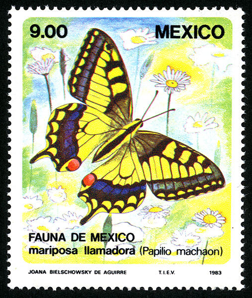No. Scott: 1327 -- Año de Emisión: 1983 -- Valor facial: Nueve Pesos -- Variedad de color: Multicolor -- Perforación: 14 -- Tipo de impresión: Grabado Timbre Postal Mexicano, al fondo de la imagen se observa un paisaje con árboles y flores, en primer plano aparece una mariposa multicolor, en la parte superior está escrito el valor facial de "9.00", "MEXICO" y en la parte inferior "FAUNA DE MEXICO, Mariposa llamadora (Papilio Machaon)". Para más información favor de dirigirse a biblioteca@mufi.org.mx