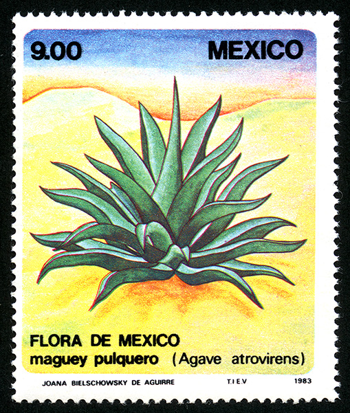 No. Scott: 1325 -- Año de Emisión: 1983 -- Valor facial: Nueve Pesos -- Variedad de color: Multicolor -- Perforación: 14 -- Tipo de impresión: Grabado Timbre Postal Mexicano multicolor, la imagen nos representa un paisaje árido, en el aparece una planta suculenta de tamaño mediano con tallo corto, hojas anchas, gruesas y carnosas de color verde grisáceo, en la parte superior aparece escrito el valor facial de "9.00", "MEXICO" y en la parte inferior "FLORA DE MEXICO" "Maguey Pulquero" (Agave atrovirens). Para más información favor de dirigirse a biblioteca@mufi.org.mx