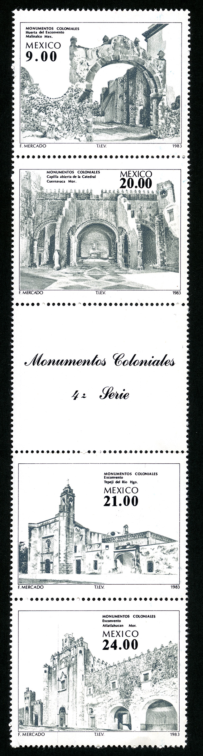 No. Scott: 1340 -- Año de Emisión: 1983 -- Valor facial: Veintiún Pesos -- Variedad de color: Gris y Negro-- Perforación: 14 -- Tipo de impresión: Grabado Timbre Postal Mexicano en colores gris y negro, en la imagen se observa el Convento de Tepeji del Río, perteneciente al estado de Hidalgo, en la parte superior del lado derecho está escrito "MONUMENTOS COLONIALES", "MEXICO" y el valor facial de "21.00". Para más información favor de dirigirse a biblioteca@mufi.org.mx