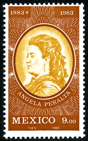 No. Scott: 1323 -- Año de Emisión: 1983 -- Valor facial: Nueve Pesos -- Variedad de color: Sepia y Café -- Perforación: 14 -- Tipo de impresión: Grabado Timbre Postal Mexicano en colores sepia y café, en la imagen observamos el retrato de la cantante y soprano Ángela Carrasco, el cual se centra en un óvalo, en la parte superior aparece escrito el periodo (1883-1983), en la parte inferior "MEXICO" y el valor facial de "9.00". Para más información favor de dirigirse a biblioteca@mufi.org.mx