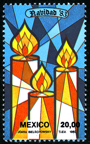 No. Scott: 1329 -- Año de Emisión: 1983 -- Valor facial: Veinte Pesos -- Variedad de color: Multicolor -- Perforación: 14 -- Tipo de impresión: Grabado Timbre Postal Mexicano multicolor, en la imagen observamos un vitral de velas navideñas, en la partye superior está escrito "NAVIDAD 83" y en la parte inferior "MEXICO" y el valor facial de "20.00". Para más información favor de dirigirse a biblioteca@mufi.org.mx