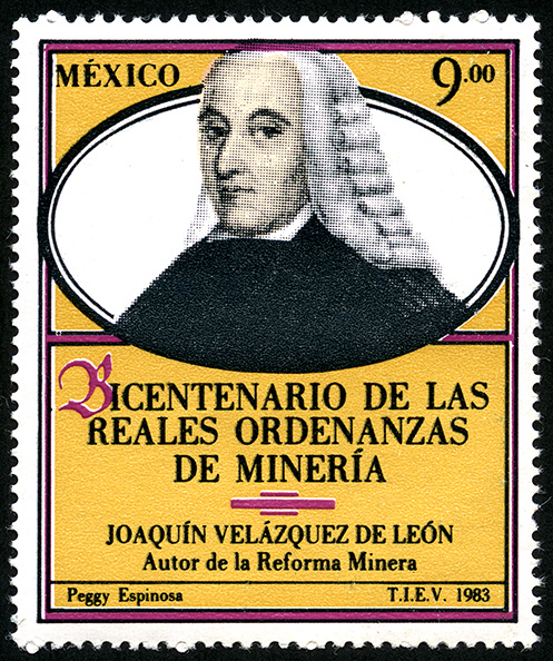No. Scott: 1343 -- Año de Emisión: 1983 -- Valor facial: Nueve Pesos -- Variedad de color: Amarillo, Negro, Gris y Violeta -- Perforación: 14 -- Tipo de impresión: GrabadoTimbre Postal Mexicano en colores amarillo, negro, gris y violeta, en la imagen observamos el retrato de Joaquín Velázquez Cárdenas de León, autor de la Reforma Minera, en la parte superior está escrito "MÉXICO", el valor facial de "9.00", en la parte central e inferior "BICENTENARIO DE LAS REALES ORDENANZAS DE MINERÍA" y "JOAQUÍN VELÁZQUEZ DE LEÓN".