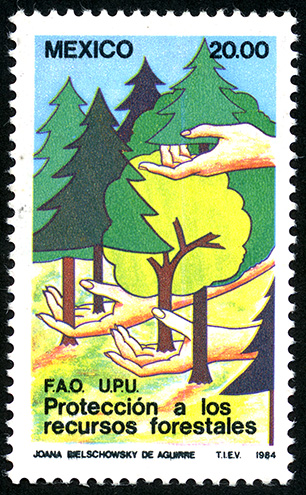 No. Scott: 1350 -- Año de Emisión: 1984 -- Valor facial: Veinte Pesos -- Variedad de color: Verde, Amarillo, Azul, Rojo y Negro -- Perforación: 14 -- Tipo de impresión: Grabado Timbre Postal Mexicano en colores verde, amarillo, azul, rojo y negro, en la imagen se observa un paisaje natural con variedad de árboles, principalmente son pinos y tres manos que los sostienen, en la parte superior está escrito "MEXICO" y el valor facial de "20.00", en la parte inferior "FAO", "UPU", "Protección a los Recursos Forestales". Para más información favor de dirigirse a biblioteca@mufi.org.mx
