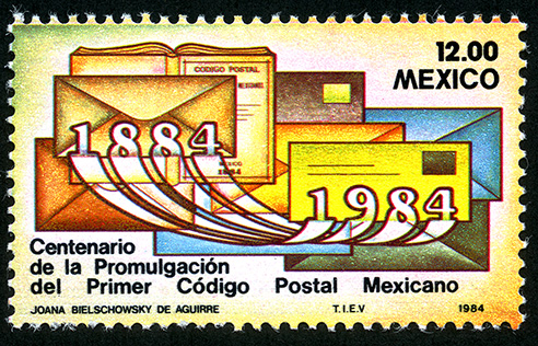 No. Scott: 1344 -- Año de Emisión: 1984 -- Valor facial: Doce Pesos -- Variedad de color: Multicolor -- Perforación: 14 -- Tipo de impresión: Grabado Timbre Postal Mexicano multicolor en la imagen se observa parte del Código Postal, así como una variedad de sobres, posiblemente sean cartas, en la parte superior del lado derecho está escrito el valor facial de "12.00" y "MEXICO", en el centro "1884-1984" y en la parte inferior "Centenario de la Promulgación del Primer Códigpo Postal Mexicano Para más información favor de dirigirse a biblioteca@mufi.org.mx
