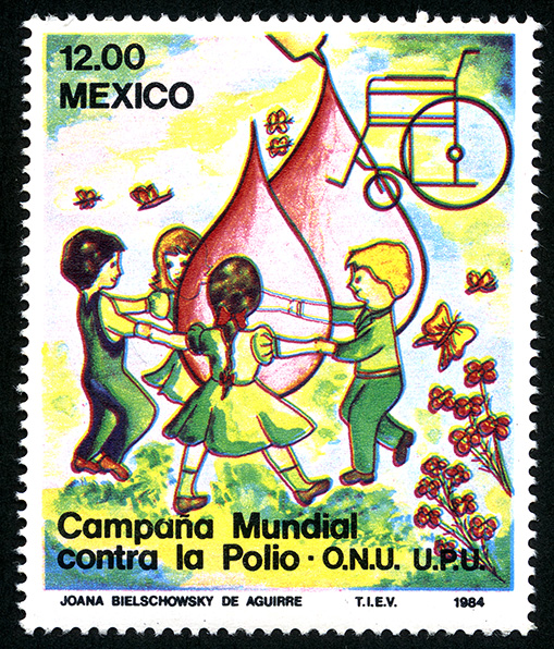 No. Scott: 1345 -- Año de Emisión: 1984 -- Valor facial: Doce Pesos -- Variedad de color: Multicolor -- Perforación: 14 -- Tipo de impresión: Grabado Timbre Postal Mexicano multicolor, la imagen me representa un jardín con cuatro niños jugando en rueda, en medio se observan dos globos grandes en forma de gotas, alrededor de elllos hay mariposas y flores, arriba del lado izquierdo está escrito el valor facial de "12.00" y "MEXICO", del lado derecho aparece una silla de ruedas y en la parte inferior "Campaña Mundial contra la Polio, ONU-UPU". Para más información favor de dirigirse a biblioteca@mufi.org.mx