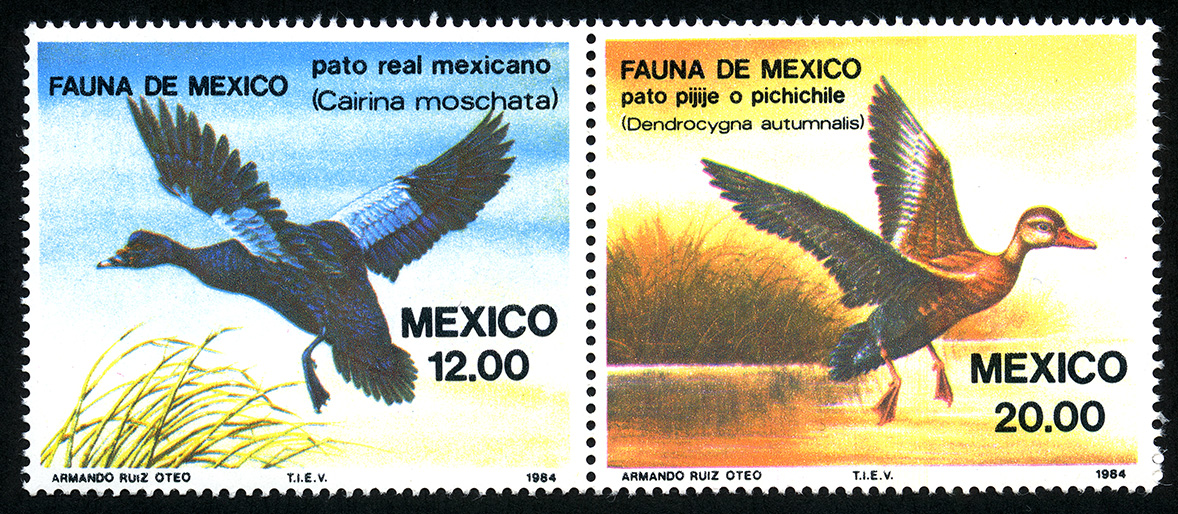 No. Scott: 1346 -- Año de Emisión: 1984 -- Valor facial: Doce Pesos -- Variedad de color: Multicolor -- Perforación: 14 -- Tipo de impresión: Grabado Timbre Postal Mexicano Multicolor, la imagen nos representa un ave acuática en vuelo,con un poco de vegetación, en la parte superior está escrito "FAUNA DE MEXICO" "Pato Real Mexicano" (Cairina mostacha), en la parte inferior del lado derecho "MEXICO" y el valor facial de "12.00". Para más información favor de dirigirse a biblioteca@mufi.org.mx