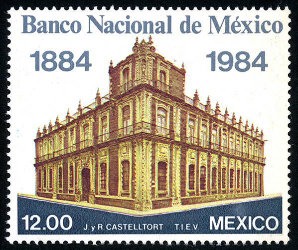No. Scott: 1349 -- Año de Emisión: 1984 -- Valor facial: Doce Pesos -- Variedad de color: Café, Amarillo y Gris -- Perforación: 14 -- Tipo de impresión: Grabado Timbre Postal Mexicano en colores café, amarillo y gris, en la imagen observamos la fachada del edificio del Banco Nacional de México, en la parte superior están escrito los años 1884-1984, en la parte inferior el valor facial de "12.00" y "MEXICO". Para más información favor de dirigirse a biblioteca@mufi.org.mx