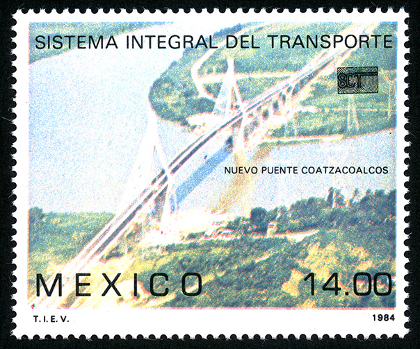 No. Scott: 1366 -- Año de Emisión: 1984 -- Valor facial: Catorce Pesos -- Variedad de color: Verde, Azul, Amarillo y Café -- Perforación: 14 -- Tipo de impresión: Grabado Timbre Postal Mexicano en colores verde, azul, amarillo y café, la imagen nos muestra una toma aérea de un puente carretero, sobre una zona urbana, atravezada por un río, en la parte superior está escrirto "SISTEMA INTEGRAL DEL TRANSPORTE", en la parte inferior "MEXICO" y el valor facial de "14.00". Para más información favor de dirigirse a biblioteca@mufi.org.mx