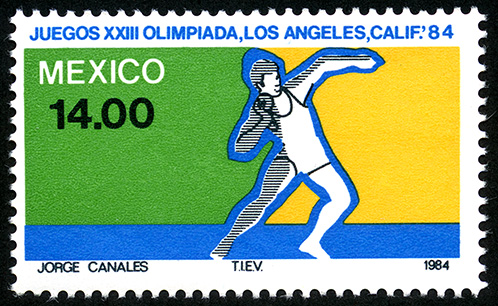 No. Scott: 1351 -- Año de Emisión: 1984 -- Valor facial: Catorce Pesos -- Variedad de color: Verde, Amarillo, Azul y Negro -- Perforación: 14 -- Tipo de impresión: Grabado Timbre Postal Mexicano en colores verde, amarillo, azul y negro, en la ilustración observamos a un deportista con una mano arriba y en la otra sosteniendo algo redondo en posición de lanzamiento, en la parte superior esta escrito "JUEGOS XXIII OLIMPIADA, LOS ANGELES ,CALIF.84", "MEXICO" y el valor facial de "14.00". Para más información favor de dirigirse a biblioteca@mufi.org.mx