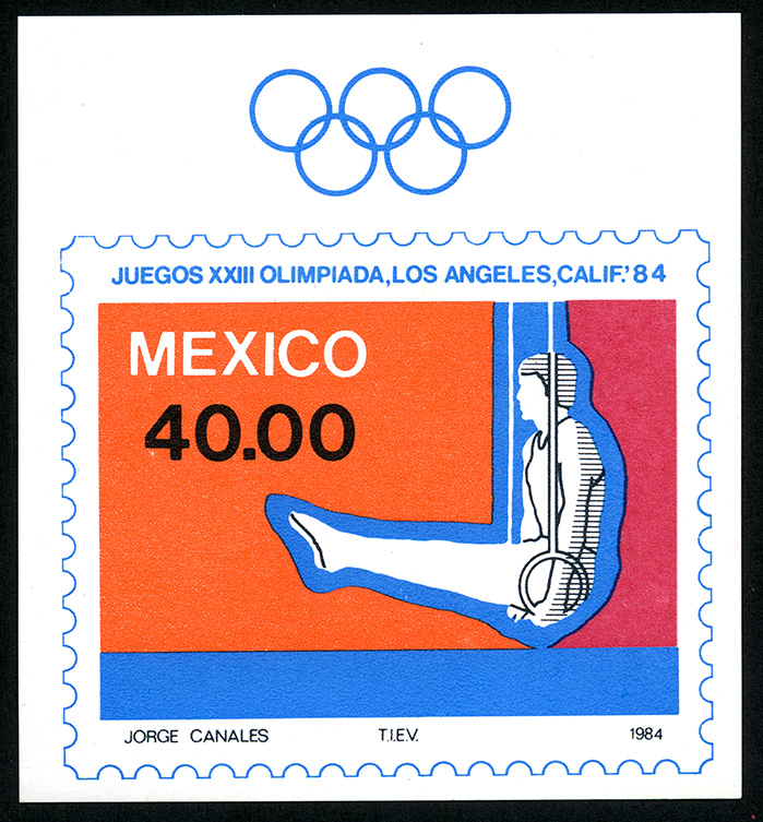 No. Scott: 1357 -- Año de Emisión: 1984 -- Valor facial: Cuarenta Pesos -- Variedad de color: Naranja, Rojo, Azul y Negro -- Sin Perforación -- Tipo de impresión: Grabado Hoja recuerdo imperforada en colores naranja, rojo, azul y negro, en la ilustración observamos a un hombre en movimiento, con las piernas extendidas y en las manos sujetando unos aros, como si fuera a columpiarse, en la parte superior está escrito "JUEGOS XXIII OLIMPIADA, LOS ANGELES, CALF.84", "MEXICO" y el valor facial de "40.00". Para más información favor de dirigirse a biblioteca@mufi.org.mx