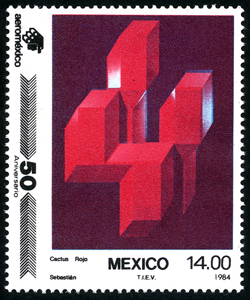 No. Scott: 1362 -- Año de Emisión: 1984 -- Valor facial: Catorce Pesos -- Variedad de color: Rojo Oscuro, Negro, Azul -- Perforación: 14 x 14 1/2 -- Tipo de impresión: Grabado Timbre Postal Mexicano en colores rojo oscuro, negro y azul, en la imagen observamos una figura tridimensional, principalmente son cuadros y rectángulos, mismos que dan forma a un cactus, en la parte inferior está escrito "MEXICO" y el valor facial de "14.00". Para más información favor de dirigirse a biblioteca@mufi.org.mx