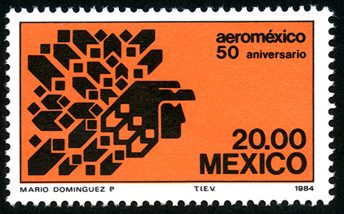 No. Scott: 1363 -- Año de Emisión: 1984 -- Valor facial: Veinte Pesos -- Variedad de color: Naranja y Negro -- Perforación: 14 x 14 1/2 -- Tipo de impresión: Grabado Timbre Postal Mexicano en colores naranja y negro, en el lado izquierdo de la imagen, observamos el logotipo de la aerolínea Aeroméxico, del lado derecho, parte baja, está escrito el valor facial de "20.00" y "MEXICO". Para más información favor de dirigirse a biblioteca@mufi.org.mx