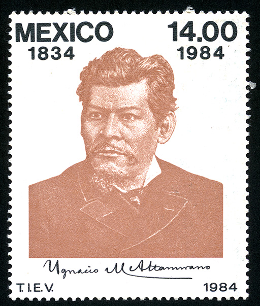 No. Scott: 1370 -- Año de Emisión: 1984 -- Valor facial: Catorce Pesos -- Variedad de color: sepia y Negro -- Perforación: 14 -- Tipo de impresión: Huecograbado Timbre Postal Mexicano en colores sepia y negro, en la imagen observamos al periodista y político mexicano, Ignacio Manuel Altamirano, en la parte superior está escrito "MEXICO", el valor facial de "14.00" y el periodo "1834-1984". Para más información favor de dirigirse a biblioteca@mufi.org.mx