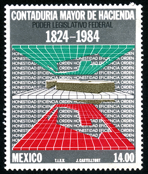 No. Scott: 1371 -- Año de Emisión: 1984 -- Valor facial: Catorce Pesos -- Variedad de color: Gris, Rojo, Verde, Oro y Negro -- Perforación: 14 -- Tipo de impresión: Huecograbado Timbre Postal Mexicano en colores gris, rojo, verde, oro y negro, la imagen nos muestra el mapa de México en tres etapas de forma tridimencional, en la parte superior está escrito "CONTADURIA MAYOR DE HACIENDA", "PODER LEGISLATIVO FEDERAL", "1824-1984", en la parte inferior "MEXICO" y el valor facial de "14.00". Para más información favor de dirigirse a biblioteca@mufi.org.mx