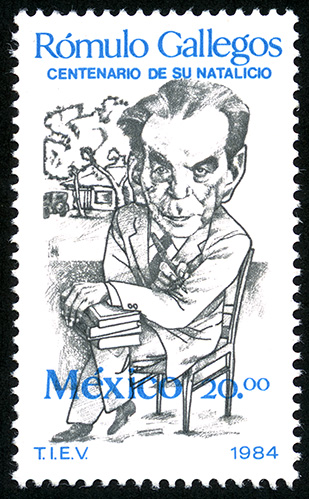 No. Scott: 1374 -- Año de Emisión: 1984 -- Valor facial: Veinte Pesos -- Variedad de color: Gris y Azul -- Perforación: 14 -- Tipo de impresión: Huecograbado Timbre Postal Mexicano en colores gris y negro, en la imagen observamos a un personaje sentado sobre una silla con las piernas cruzadas, sobre de ellas hay tres libros y una mano encima, la otra mano sostiene una pluma, en la parte de atrás, se aprecia un árbol, una casa y parece que un auto, en la parte sperior está escrito "RÓMULO GALLEGOS", "CENTENARIO DE SU NATALICIO", en la parte inferior "MEXICO" y el valor facial de "20.00". Para más información favor de dirigirse a biblioteca@mufi.org.mx
