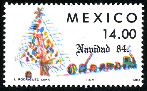 No. Scott: 1368 -- Año de Emisión: 1984 -- Valor facial: Catorce Pesos -- Variedad de color: Multicolor -- Perforación: 14 -- Tipo de impresión: Huecograbado Timbre Postal Mexicano multicolor, en la imagen observamos un árbol de navidad y un tren de juguete, elaborados posiblemente por algún niño, sobe la misma aparece escrito "MEXICO", el valor facial de "14.00" y "NAVIDAD 84". Para más información favor de dirigirse a biblioteca@mufi.org.mx