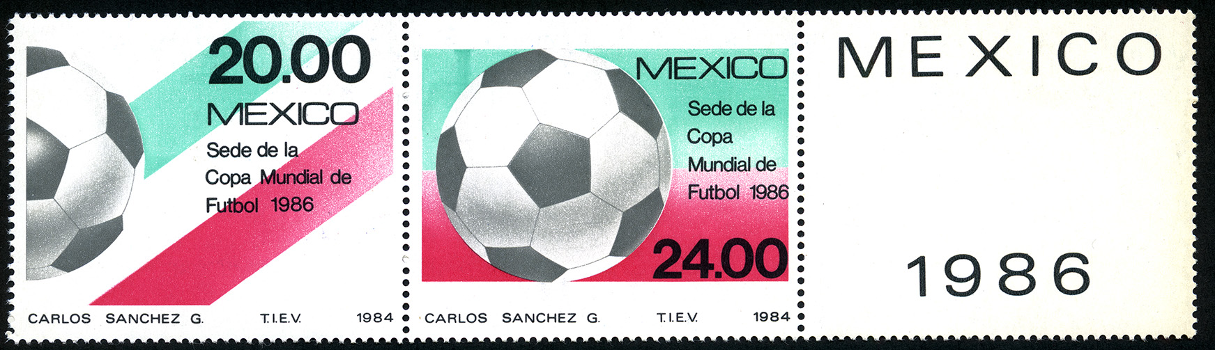 No. Scott: 1372 -- Año de Emisión: 1984 -- Valor facial: Veinte Pesos -- Variedad de color: Gris, Verde, Rojo y Negro -- Perforación: 14 -- Tipo de impresión: Huecograbado Timbre Postal Mexicano el colores gris, verde, rojo y negro, del lado izquierdo de la imagen observamos la parte de un balón de fútbol, y los colores de la bandera de México, sobre la misma está escrito el valor facial de "20.00", "MEXICO" y "Sede de la Copa Mundial de Futbol 1986". Para más información favor de dirigirse a biblioteca@mufi.org.mx
