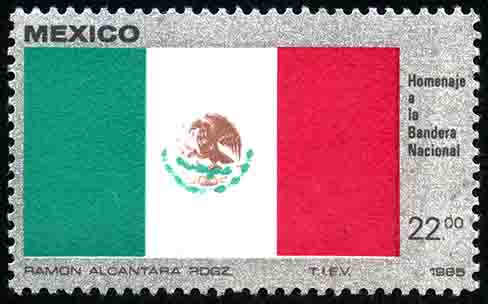 No. Scott: 1376 -- Año de Emisión: 1985 -- Valor facial: Veintidos Pesos -- Variedad de color: Gris, Verde, Rojo, Negro y Café -- Perforación: 14 -- Tipo de impresión: Huecograbado Timbre Postal Mexicano en colores gris, verde, rojo, negro y café, en la imagen observamos la bandera nacional de México, en la parte superior izquierdo está escrito "MEXICO", y en la parte inferior del lado derecho, el valor facial de "22.00". Para más información favor de dirigirse a biblioteca@mufi.org.mx