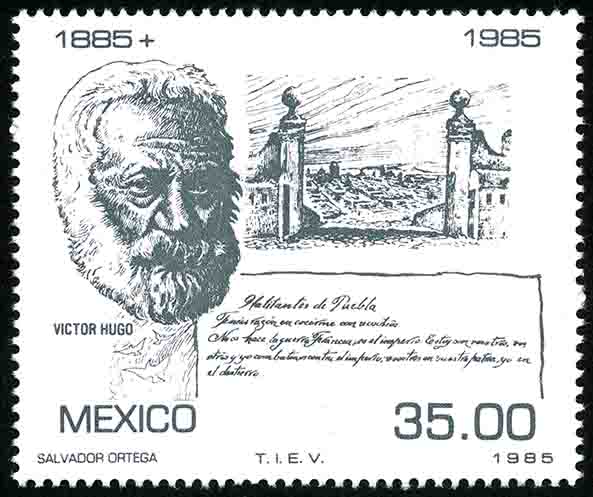 No. Scott: 1381 -- Año de Emisión: 1985 -- Valor facial: Treinta y Cinco Pesos -- Variedad de color: Gris Pizarra -- Perforación: 14 -- Tipo de impresión: Huecograbado Timbre Postal Mexicano en color gris pizarra, en la imagen se observa al poeta y novelista Victor Hugo, así como la vista de un poblado o de alguna ciudad, en la parte superior está escrito el periodo "1885-1985", en la parte inferior "MEXICO" y el valor facial de "35.00". Para más información favor de dirigirse a biblioteca@mufi.org.mx