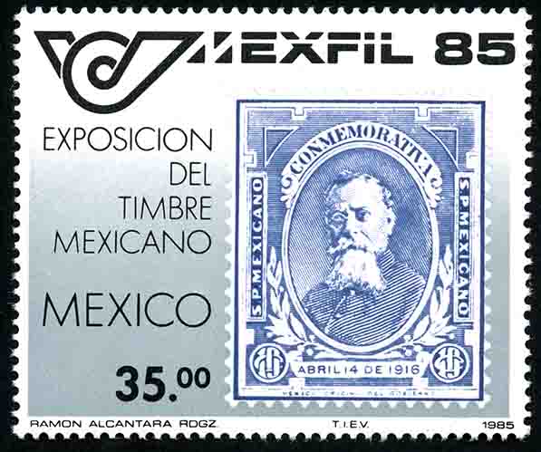 No. Scott: 1383 -- Año de Emisión: 1985 -- Valor facial: Treinta y Cinco Pesos -- Variedad de color: Gris, Azul y Negro -- Perforación: 14 -- Tipo de impresión: Huecograbado Timbre Postal Mexicano en colores gris, azul y negro, en la imagen se observa la estampilla de Venustiano Carranza, con valor de diez centavos, también aparece escrito "MEXTIL 85", "EXPOSICION DEL TIMBRE MEXICANO", "MEXICO" y el valor facial de "35.00". Para más información favor de dirigirse a biblioteca@mufi.org.mx