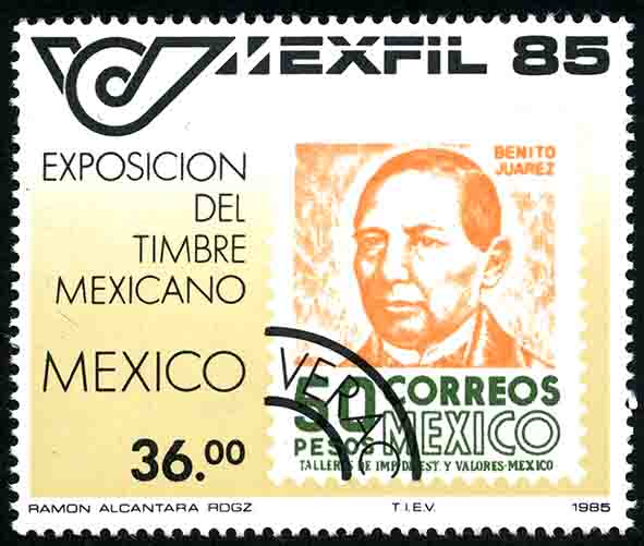 No. Scott: 1384 -- Año de Emisión: 1985 -- Valor facial: Treinta y seis Pesos -- Variedad de color: Beige, Naranja, Negro y Verde -- Perforación: 14 -- Tipo de impresión: Huecograbado Timbre Postal Mexicano en colores beige, naranja, negro y verde, en la imagen se observa la estampilla de Benito Juárez, con valor de cincuenta pesos, también aparece escrito "MEXTIL 85", "EXPOSICION DEL TIMBRE MEXICANO", "MEXICO" y el valor facial de "36.00". Para más información favor de dirigirse a biblioteca@mufi.org.mx