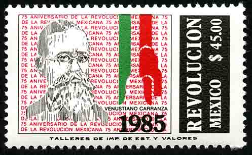 No. Scott: 1417 -- Año de Emisión: 1985 -- Valor facial: Cuarenta y Cinco Pesos -- Variedad de color: Negro, Rojo y Verde -- Perforación: 14 -- Tipo de impresión: Huecograbado Timbre Postal Mexicano en colores negro, rojo y verde, en el fondo de la imagen está impreso 75 Aniversario de la Revolución Mexicana, en primer plano del lado izquierdo aparece el retrato de Venustiano Carranza y del lado derecho los colores verde y rojo, también aparece escrito "REVOLUCION", "MEXICO" y el valor facial del "45.00". Para más información favor de dirigirse a biblioteca@mufi.org.mx