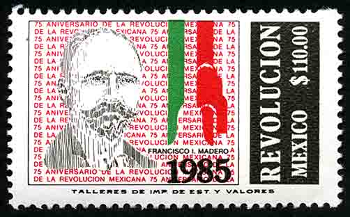 No. Scott: 1418 -- Año de Emisión: 1985 -- Valor facial: Ciento Diez Pesos -- Variedad de color: Negro, Rojo y Verde -- Perforación: 14 -- Tipo de impresión: Huecograbado Timbre Postal Mexicano en colores negro, rojo y verde, en el fondo de la imagen está impreso 75 Aniversario de la Revolución Mexicana, en primer plano del lado izquierdo aparece el retrato de Francisco Ignacio Madero y del lado derecho los colores verde y rojo, también aparece escrito "REVOLUCION", "MEXICO" y el valor facial del "110.00". Para más información favor de dirigirse a biblioteca@mufi.org.mx