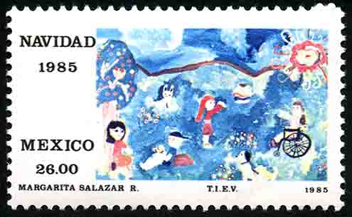 No. Scott: 1412 -- Año de Emisión: 1985 -- Valor facial: Veintiseis Pesos -- Variedad de color: Multicolor -- Perforación: 14 x 14 1/2-- Tipo de impresión: Huecograbado Timbre Postal Mexicano multicolor, en la imagen se observa un dibujo infantil, elaborado en acuarela, alusivo a la navidad, del lado izquierdo está escrito "NAVIDAD 85", "MEXICO" y el valor facial de "26.00". Para más información favor de dirigirse a biblioteca@mufi.org.mx