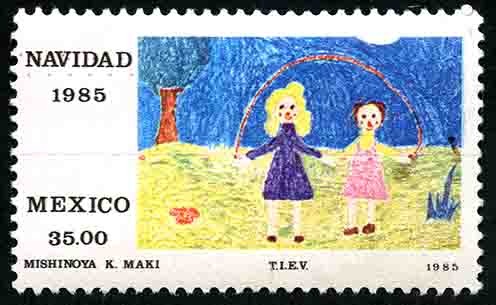 No. Scott: 1413 -- Año de Emisión: 1985 -- Valor facial: Treinta y Cinco Pesos -- Variedad de color: Multicolor -- Perforación: 14 x 14 1/2-- Tipo de impresión: Huecograbado Timbre Postal Mexicano multicolor, en la imagen se observa un dibujo infantil, elaborado en acuarela, alusivo a la navidad, del lado izquierdo está escrito "NAVIDAD 85", "MEXICO" y el valor facial de "35.00". Para más información favor de dirigirse a biblioteca@mufi.org.mx