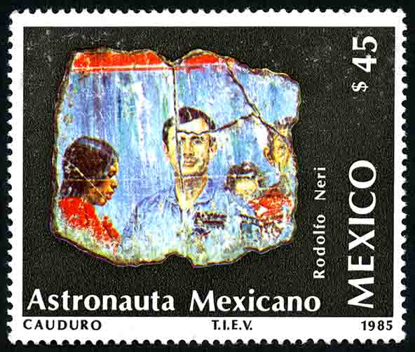 No. Scott: 1422 -- Año de Emisión: 1985 -- Valor facial: Cuarenta y Cinco Pesos -- Variedad de color: Multicolor -- Perforación: 14 x 14 1/2-- Tipo de impresión: Huecograbado Timbre Postal Mexicano multicolor, en la imagen se observa la pintura del primer austronauta "Rodolfo Neri Vela, del artista Rafael Cauduro, en la parte inferior está escrito "Austronauta Mexicano", en la parte lateral el lado derecho "Rodolfo Neri", "MEXICO" y el valor facial de "45.00". Para más información favor de dirigirse a biblioteca@mufi.org.mx