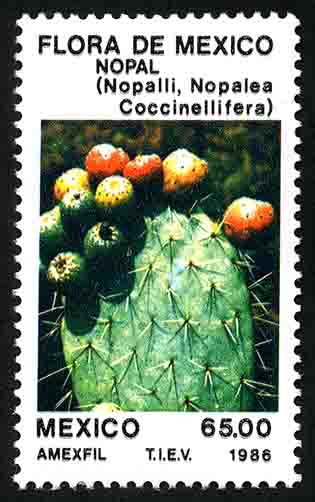 No. Scott: 1435 -- Año de Emisión: 1986 -- Valor facial: Sesenta y Cinco Pesos -- Variedad de color: Multicolor -- Perforación: 14 1/2 x 14 -- Tipo de impresión: Huecograbado Timbre Postal Mexicano multicolor, en la imagen se observa una planta color verde y cuerpo espinoso con muchos frutos en diferentes colores, en la parte superior está escrito "FLORA DE MEXICO", "NOPAL" (Nopalli, Napolea, Coccinellifera), en la parte inferior está escrito "MEXICO" y el valor facial de "65.00". Para más información favor de dirigirse a biblioteca@mufi.org.mx
