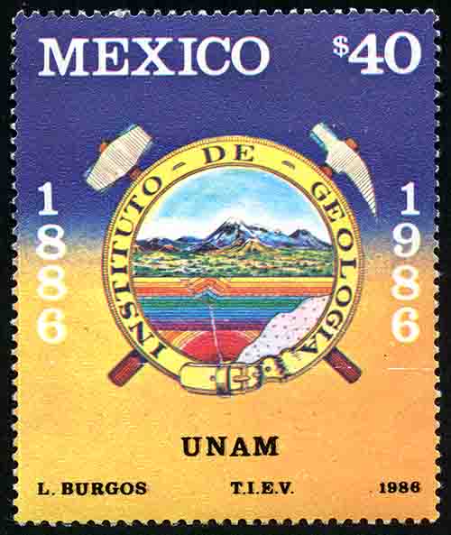 No. Scott: 1438 -- Año de Emisión: 1986 -- Valor facial: Cuarenta Pesos -- Variedad de color: Multicolor -- Perforación: 14 -- Tipo de impresión: Huecograbado Timbre Postal Mexicano multicolor, en la imagen se observa el emblema del Instituto de Geología, sobre la misma está escrito "MEXICO", "40.00", el periodo "1886-1986" y "UNAM". Para más información favor de dirigirse a biblioteca@mufi.org.mx