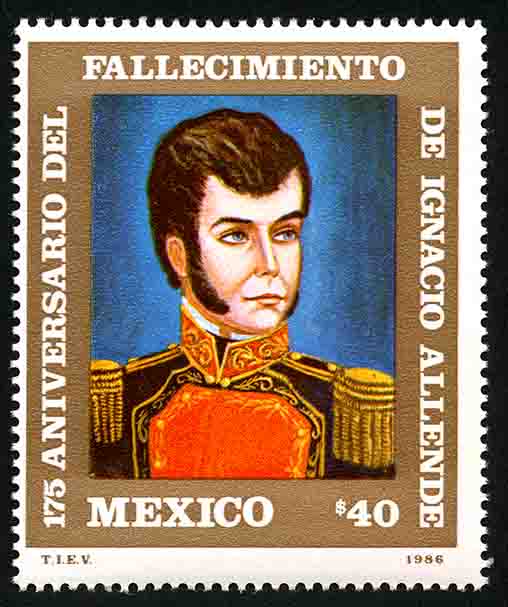 No. Scott: 1445 -- Año de Emisión: 1986 -- Valor facial: Cuarenta Pesos -- Variedad de color: Multicolor -- Perforación: 14 -- Tipo de impresión: Huecograbado Timbre Postal Mexicano multicolor, en la imagen se observa el retrato de Ignacio José de Allende, sobre el contorno está escrito "175 ANIVERSARIO DEL FALLECIMIENTO DE IGNACIO ALLLENDE", en la parte inferior "MEXICO" y el valor facial de "40.00". Para más información favor de dirigirse a biblioteca@mufi.org.mx