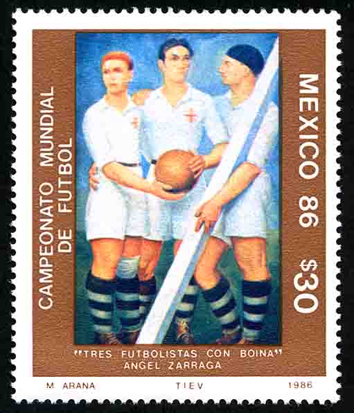 No. Scott: 1439 -- Año de Emisión: 1986 -- Valor facial: Treinta Pesos -- Variedad de color: Multicolor -- Perforación: 14 -- Tipo de impresión: Huecograbado Timbre Postal Mexicano multicolor, en la imagen aparecen tres chicos abrazados, dos de ellos sostienen con las manos un balón y el otro un palo, ellos están uniformados con pantalones cortos y camisas, medias a rayas y una especie de boinas en la cabeza, en el contorno izquierdo de la estampilla está escrito "CAMPEONATO MUNDIAL DE FUTBOL" y en el contorno derecho "MEXICO 86" y el valor facial de "30.00". Para más información favor de dirigirse a biblioteca@mufi.org.mx