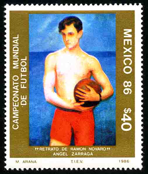 No. Scott: 1440 -- Año de Emisión: 1986 -- Valor facial: cuarenta Pesos -- Variedad de color: Multicolor -- Perforación: 14 -- Tipo de impresión: Huecograbado Timbre Postal Mexicano multicolor, en la imagen aparece el retrato del actor mexicano Ramón Novaro, obra realizada por el pintor Ángel Zárraga, el aparece semidesnudo, solo viste un pantalón corto y está sujetando un balón con ambas manos, en la parte lateral del lado izquierdo, está escrito "CAMPEONATO MUNDIAL DE FUTBOL", del lado derecho "MEXICO 86" y el valor facial de "40.00". Para más información favor de dirigirse a biblioteca@mufi.org.mx