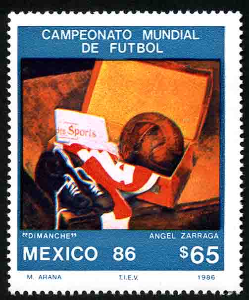 No. Scott: 1441 -- Año de Emisión: 1986 -- Valor facial: Sesenta y Cinco Pesos -- Variedad de color: Multicolor -- Perforación: 14 -- Tipo de impresión: Huecograbado Timbre Postal Mexicano multicolor, en la imagen aparece la obra "Dimanche" del pintor mexicano Ángel Zárraga, en ella se observa sobre una mesa, una caja que contiene un balón y posiblemente un uniforme deportivo y un paquete que dice "sports", a un lado de esta caja aparece un par de zapatos color negro con ahujetas blancas, en la parte superior está escrito CAMPEONATO MUNDIAL DE FUTBOL" y en la parte inferior "MEXICO 86" y el valor facial de "65.00". Para más información favor de dirigirse a biblioteca@mufi.org.mx
