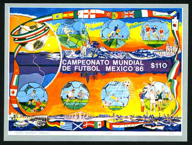 No. Scott: 1444 -- Año de Emisión: 1986 -- Valor facial: Ciento Diez Pesos -- Variedad de color: Multicolor -- Perforación: 14 -- Tipo de impresión: Huecograbado Hoja Recuerdo multicolor, la imagen nos representa la reproducción del poster para el "Campeonato Mundial de Futbol México 86", con valor facial de "110.00", en ellla se observan diferentes jugadas de futbol dentro de círculos figurando ser balones, también aparecen en el contorno las banderas de los países participantes en el mundial. Para más información favor de dirigirse a biblioteca@mufi.org.mx