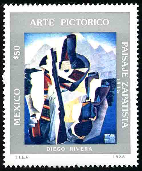 No. Scott: 1451 -- Año de Emisión: 1986 -- Valor facial: Cincuenta Pesos -- Variedad de color: Multicolor -- Perforación: 14 x 14 1/2 y 14 1/2 x 14 -- Tipo de impresión: Huecograbado Timbre Postal Mexicano multicolor, en la imagen se observa una obra del pintor Diego Rivera, titulada "Paisaje Zapatista", utilizando una temática revolucionaria, hace alusión al zarape, al sombrero y a la carabina, en la parte superior está escrito "ARTE PICTÓRICO", en el costado izquierdo "MÉXICO", el valor facial de "50.00" y sobre el costado derecho "PAISAJE ZAPATISTA 1915". Para más información favor de dirigirse a biblioteca@mufi.org.mx