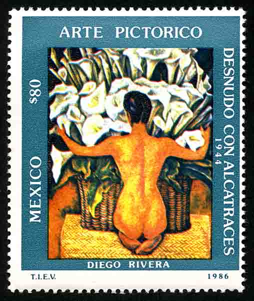 No. Scott: 1452 -- Año de Emisión: 1986 -- Valor facial: Ochenta Pesos -- Variedad de color: Multicolor -- Perforación: 14 x 14 1/2 y 14 1/2 x 14 -- Tipo de impresión: Huecograbado Timbre Postal Mexicano multicolor, en la imagen se observa una obra del pintor Diego Rivera, titulada "Desnudo con Alcatraces" del año 1944, en la parte superior está escrito "ARTE PICTÓRICO", en el contorno izquierdo "MEXICO", el valor facial de "80.00" y en el contorno derecho "DESNUDO CON ALCATRACES". Para más información favor de dirigirse a biblioteca@mufi.org.mx