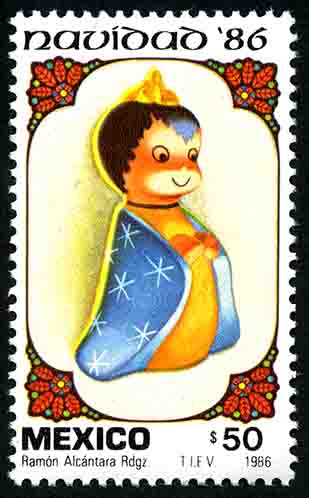 No. Scott: 1462 -- Año de Emisión: 1986 -- Valor facial: Cincuenta Pesos -- Variedad de color: Multicolor -- Perforación:14 x 14 1/2 -- Tipo de impresión: Huecograbado Timbre Postal Mexicano, en la imagen observamos una figura policromada en forma de ángel, posiblemente esté elaborada en barro, en la parte superior está escrito "NAVIDAD 86", en la parte inferior "MEXICO" y el valor facial de "50.00". Para más información favor de dirigirse a biblioteca@mufi.org.mx