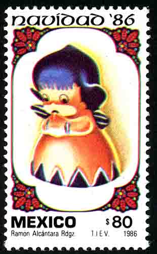 No. Scott: 1463 -- Año de Emisión: 1986 -- Valor facial: Ochenta Pesos -- Variedad de color: Multicolor -- Perforación:14 x 14 1/2 -- Tipo de impresión: Huecograbado Timbre Postal Mexicano, en la imagen observamos una figura policromada en forma de muñequita, posiblemente esté elaborada en barro, en la parte superior está escrito "NAVIDAD 86", en la parte inferior "MEXICO" y el valor facial de "80.00". Para más información favor de dirigirse a biblioteca@mufi.org.mx