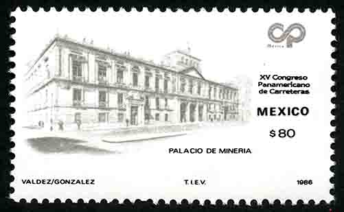 No. Scott: 1458 -- Año de Emisión: 1986 -- Valor facial: Ochenta Pesos -- Variedad de color: Gris y Negro -- Perforación:14 x 14 1/2 -- Tipo de impresión: Huecograbado Timbre Postal Mexicnao en colores gris y negro, en la imagen se observa la fachada del Palacio de Minería del estado de México, en la parte lateral del lado derecho está escrito "XV CONGRESO PANAMERICANO DE CARRETERAS", "MEXICO" y el valor facial de "80.00". Para más información favor de dirigirse a biblioteca@mufi.org.mx