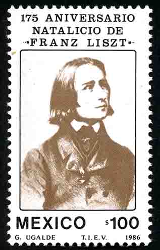 No. Scott: 1459 -- Año de Emisión: 1986 -- Valor facial: Cien Pesos -- Variedad de color: Café y Negro -- Perforación:14 1/2 x 14 -- Tipo de impresión: Huecograbado Timbre Postal Mexicano en colores café y negro, en la imagen observamos el retrato del compositor y pianista húngaro Franz Liszt , en la parte superior está escrito "175 ANIVERSARIO NATALICIO DE FRANZ LISZT", en la parte inferior "MEXICO" y el valor facial de "100.00". Para más información favor de dirigirse a biblioteca@mufi.org.mx