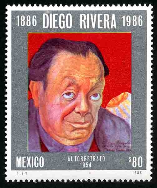 No. Scott: 1464 -- Año de Emisión: 1986 -- Valor facial: Ochenta Pesos -- Variedad de color: Multicolor -- Perforación:14 -- Tipo de impresión: Huecograbado Timbre Postal Mexicano multicolor, en la imagen se observa el autorretrato del artísta mexicano Diego Rivera, en la parte superior aparece escrito el periodo 1886-1986 y en la parte inferior "MEXICO" y el valor facial de "80.00" Para más información favor de dirigirse a biblioteca@mufi.org.mx