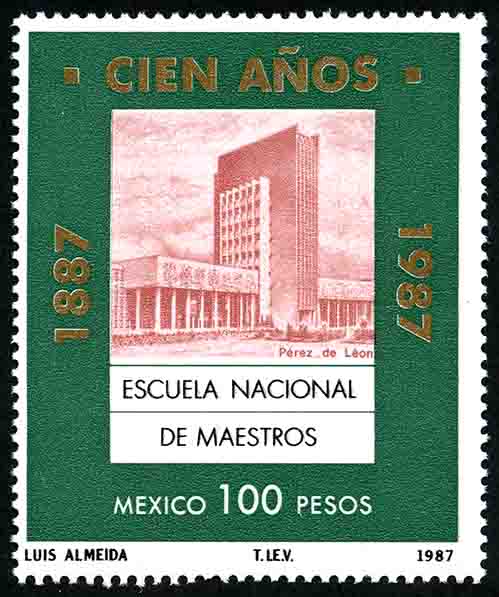 No. Scott: 1473 -- Año de Emisión: 1987 -- Valor facial: Cien Pesos -- Variedad de color: Rosa, Verde, Oro y Negro -- Perforación:14 x 14 1/2 -- Tipo de impresión: Huecograbado Timbre Postal Mexicano en colores rosa, verde, oro y negro, en la imagen observamos el edificio de la Escuela Nacional de Maestros, enmarcado en un cuadro, dentro de un fondo de color verde, en la parte superior está escrito "CIEN AÑOS", en los lados laterales "1887-1987", en la parte inferior "MEXICO" y el valor facial de "100.00". Para más información favor de dirigirse a biblioteca@mufi.org.mx